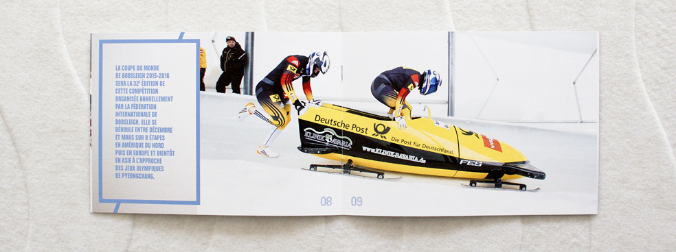 La Fédération Française des Sports de Glace met tout en place pour réussir l’aventure des jeux olympiques 2018 qui se dérouleront à Pyeongchang en Corée du Sud. Doté d’un Bobsleight hyper performant, conçu par des équipes techniques pointus, et d’athlètes de grandes qualités, il fallait concevoir un livret à la hauteur des ambitions de la FFSG pour lui permettre d’aller chercher les financements nécessaires.