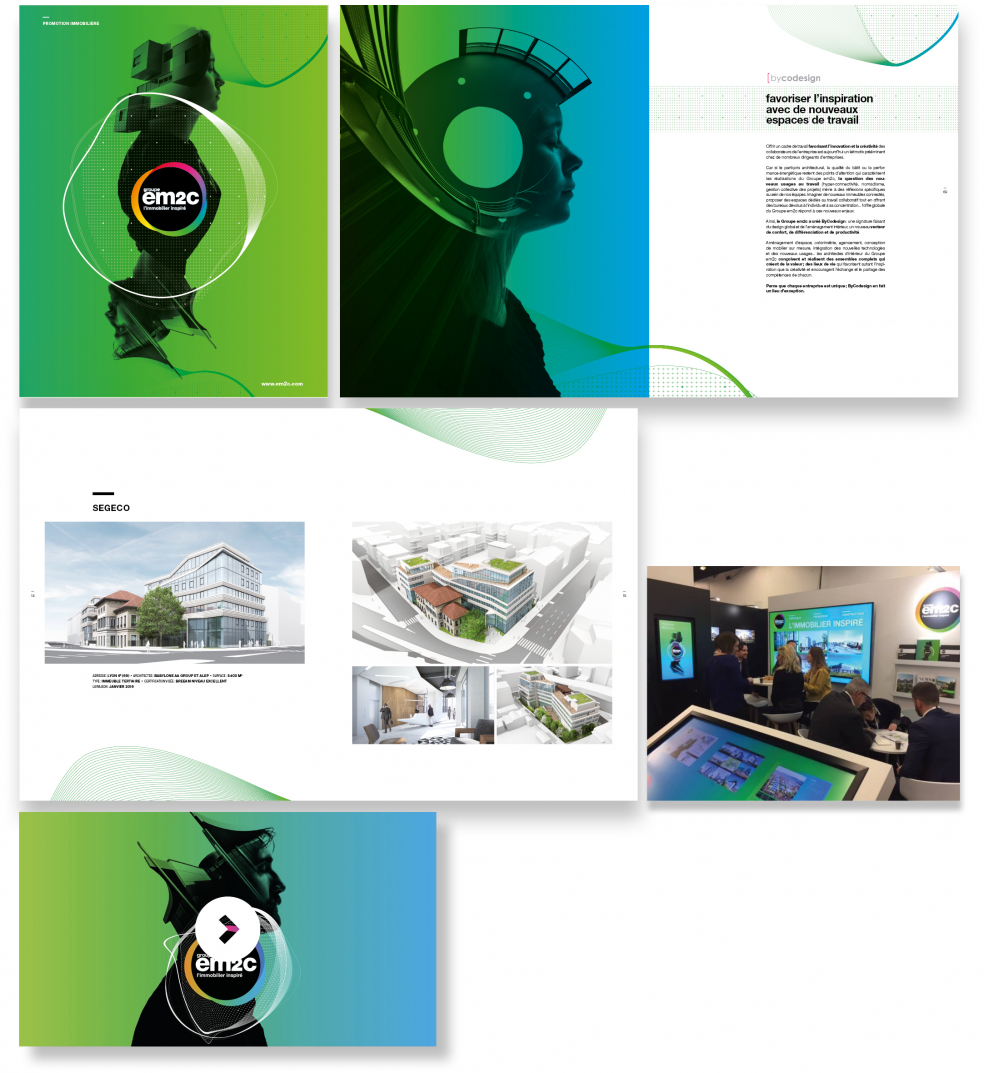 Stand SimiÀ l’occasion du Salon de l’Immobilier d’Entreprise (SIMI), édition 2018, le groupe em2c confie à Kojak Bureau de création la réalisation de l’ensemble des outils de communication : stand, bornes interactives, écrans… ainsi que la conception d’un ouvrage des réalisations récentes du groupe.