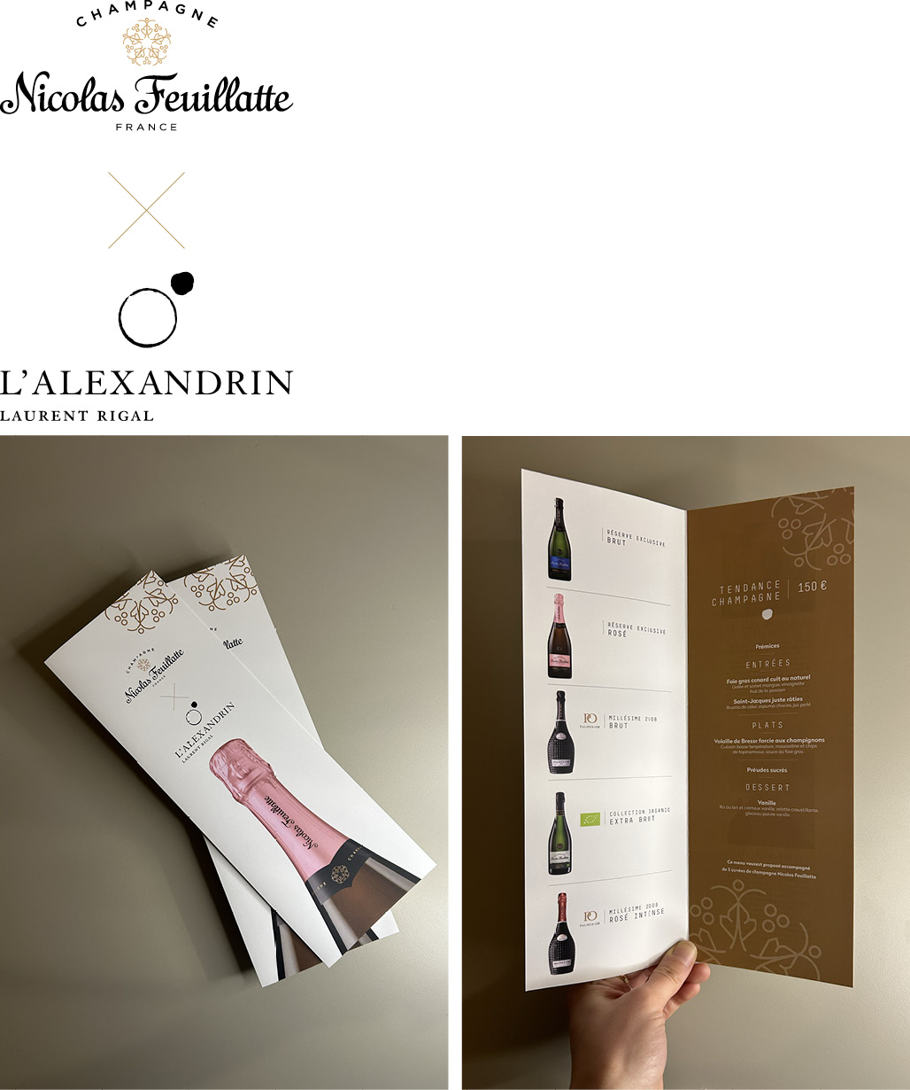 ÉditionÀ l'occasion de son partenariat avec Nicolas Feuillatte, le restaurant l'Alexandrin renouvelle la collaboration avec KOJAK pour la mise en page de ses menus.
