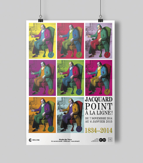 Le musée des Tissus et des Arts décoratifs de Lyon rend hommage à Jacquard et confie à Kojak Design la création du visuel de l’exposition. Pour évoquer le phénomène de démultiplication de l’image lié à l’immense succès qu’avait eu le portrait de Jacquard en 1834, au point de devenir une véritable icône, le style « Warholien » semblait tout à fait indiqué. Le visuel, partie intégrante de l’exposition, est aussi décliné sur le carton d’invitation.