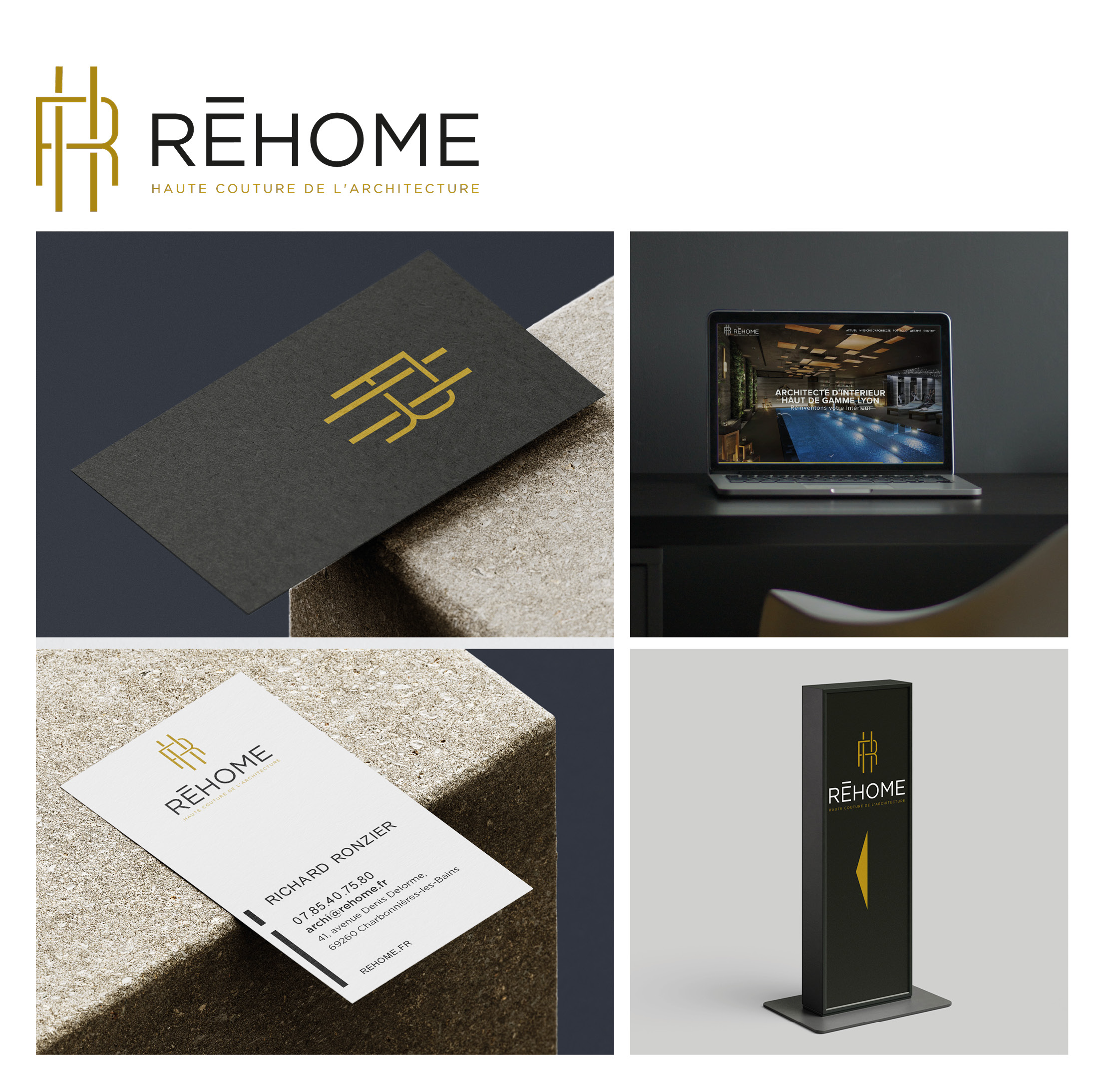 Logo, charte graphique & signalétiqueL'entreprise d'architecture d'intérieur haut de gamme Réhome à confié à KOJAK la réalisation de son identité visuelle ainsi que ses déclinaisons en signalétique.